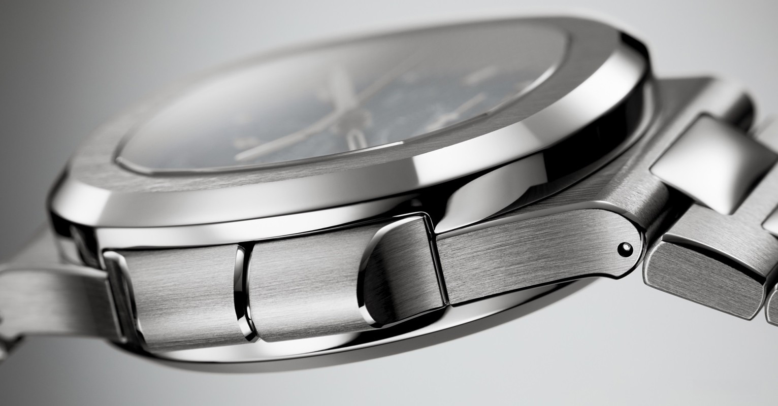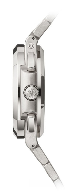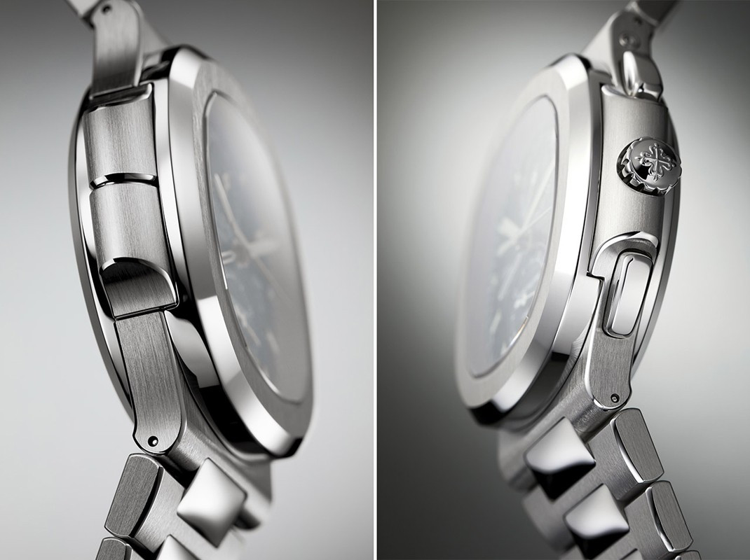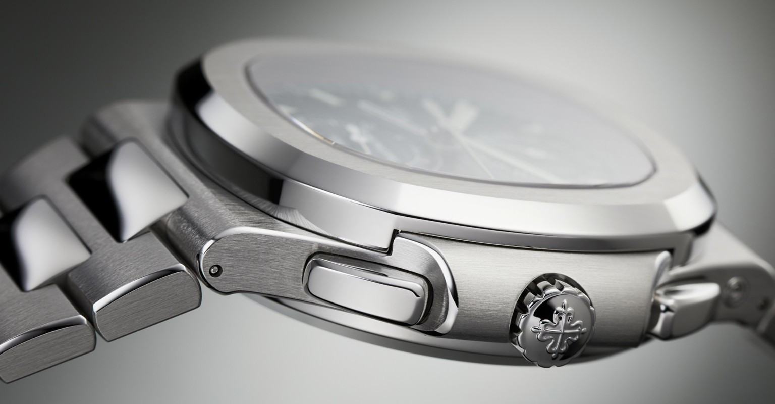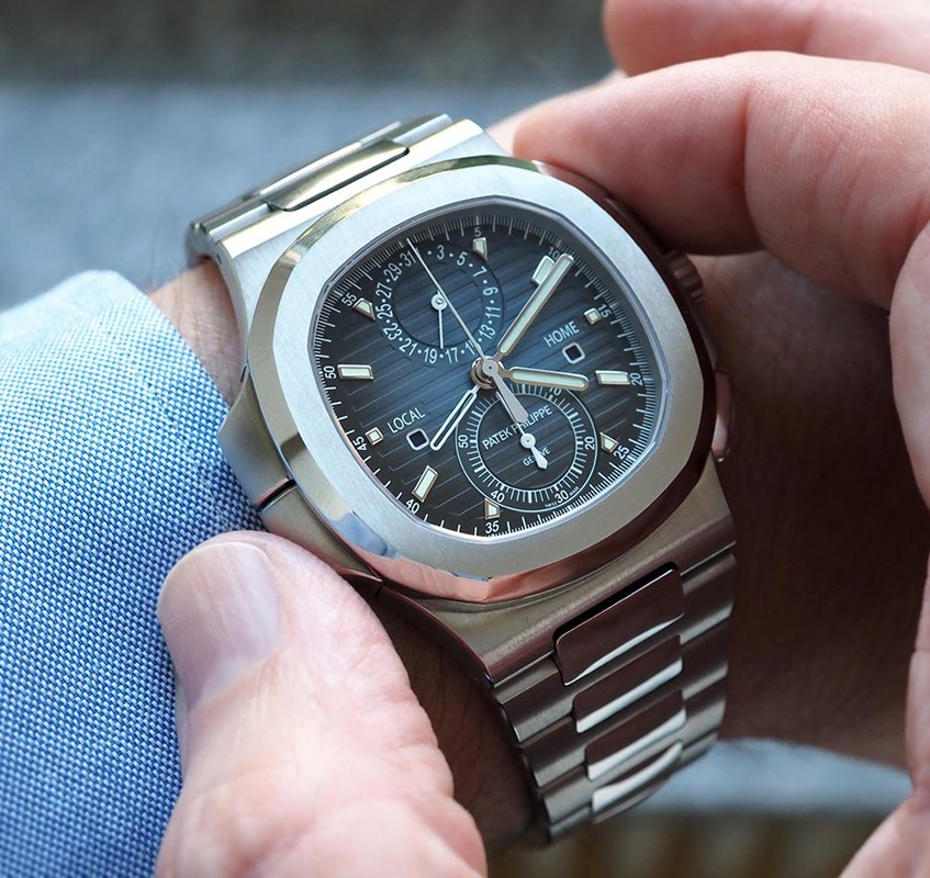 Хронограф мод. 5990/1A-011 Nautilus Travel Time - редкие часы Patek Philippe из стали. Он оснащен новым циферблатом синего цвета с узором «солнечные лучи» и нежным черным деграде по периферии. Механизм с автоматическим подзаводом CH 28-520 C FUS сочетает в себе три практичные сложные функции: flyback, Travel Time (индикация двух часовых поясов двумя отдельными часовыми стрелками; скелетонизированная стрелка показывает домашнее время) и аналоговую дату в положении «12 часов», которая синхронизируется с местным временем.
