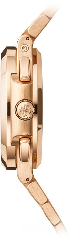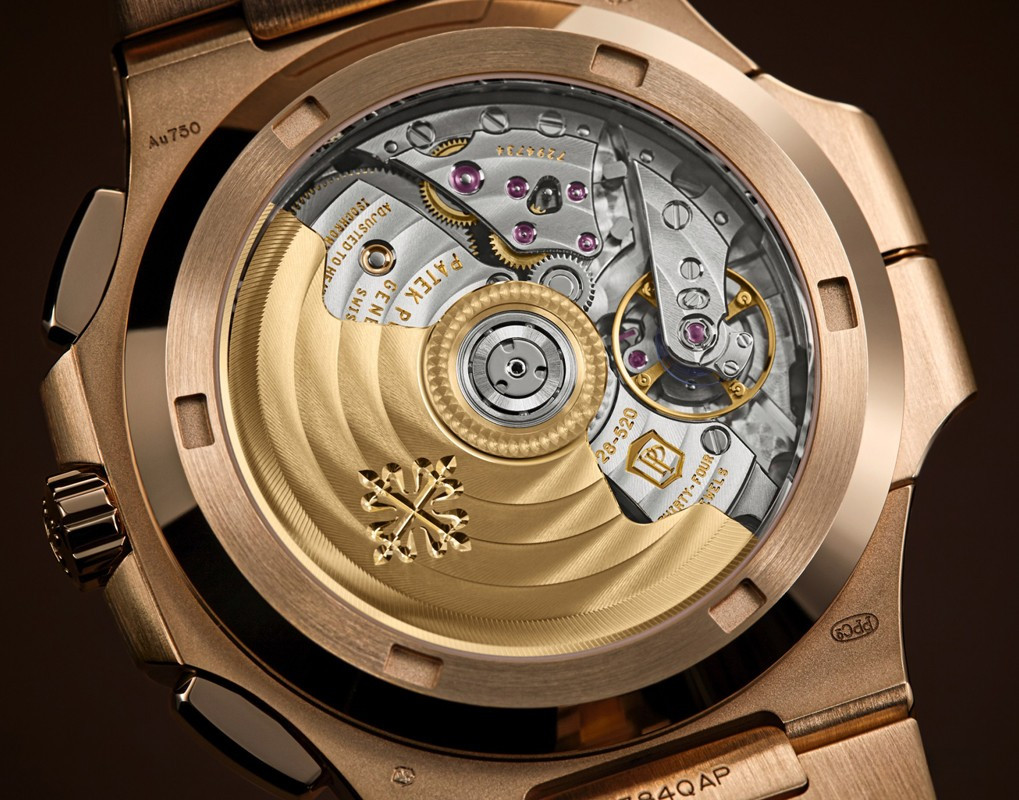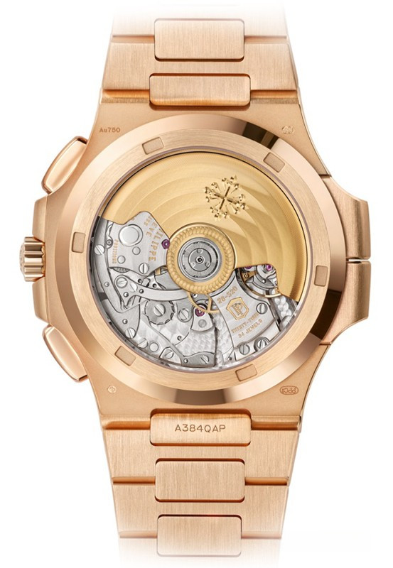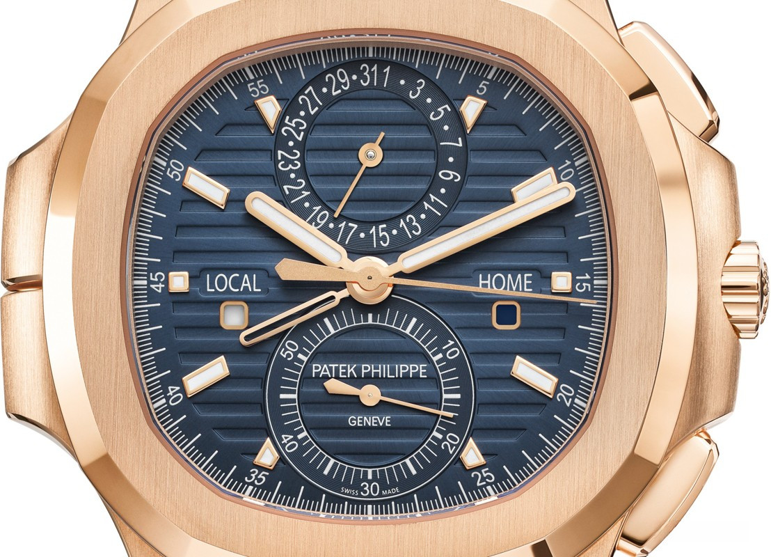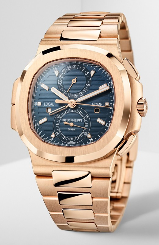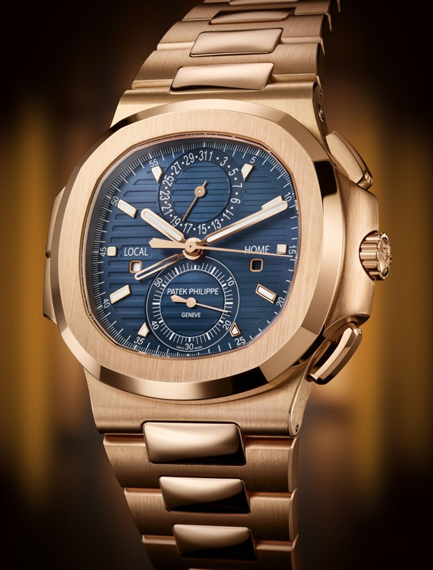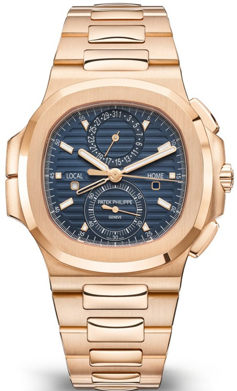Patek Philippe представляет модель Nautilus Travel Time Chronograph 5990/1 в корпусе большого размера из розового золота, который контрастирует с синим циферблатом, украшенным узором «солнечные лучи», горизонтальным рельефным узором и накладными часовыми метками. Стрелки формы «палочки» выполнены из розового золота с люминесцентным покрытием. Новая модель сочетает в себе три популярные сложные функции: хронограф с функцией flyback и автоматическим заводом, простую в использовании функцию Travel Time (индикация времени двух часовых поясов) и индикатор даты, который синхронизируется с местным временем.