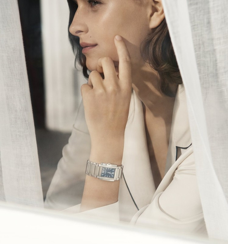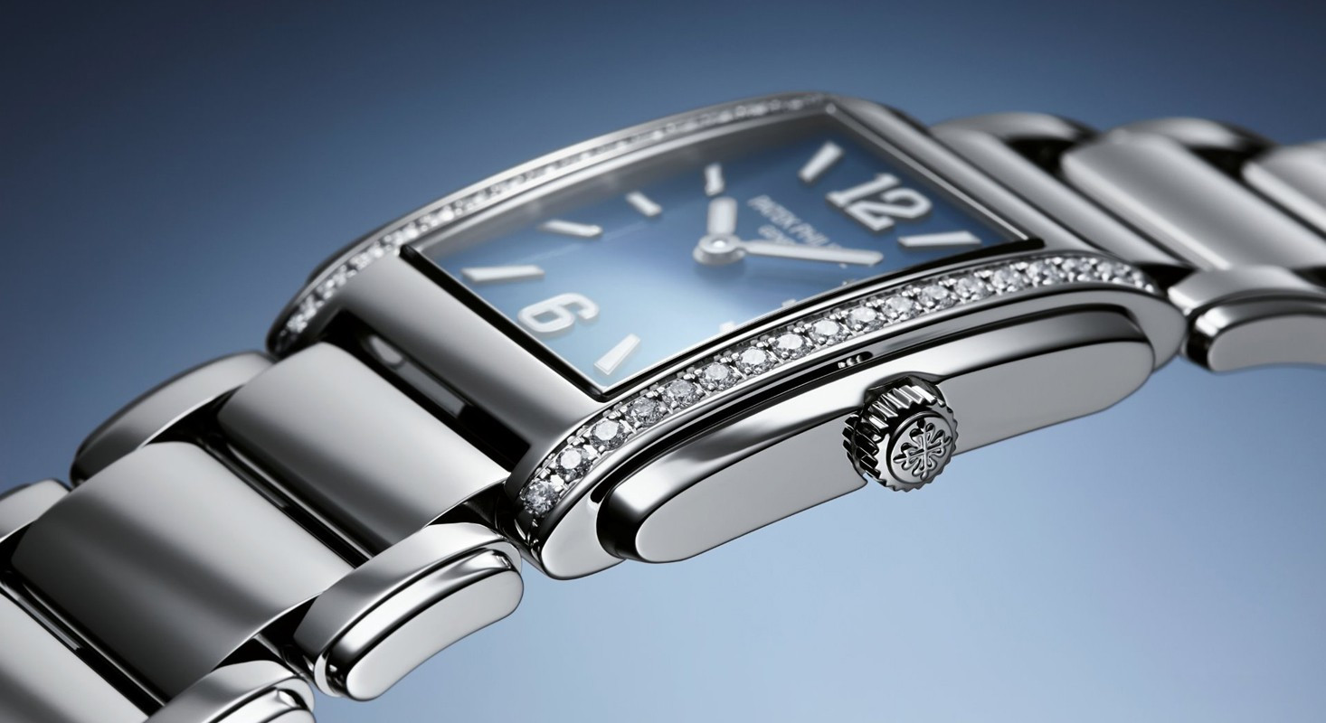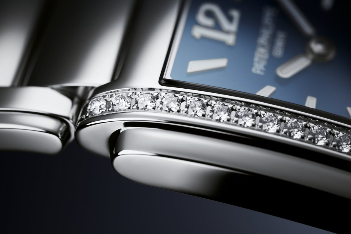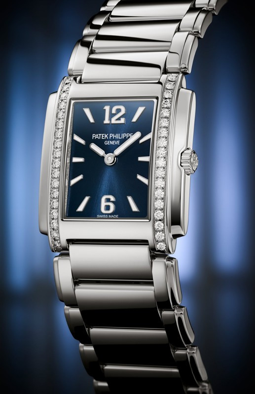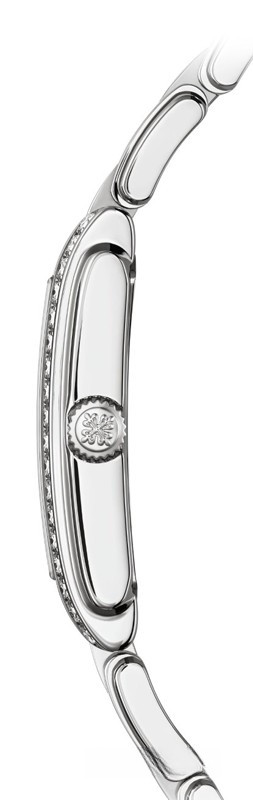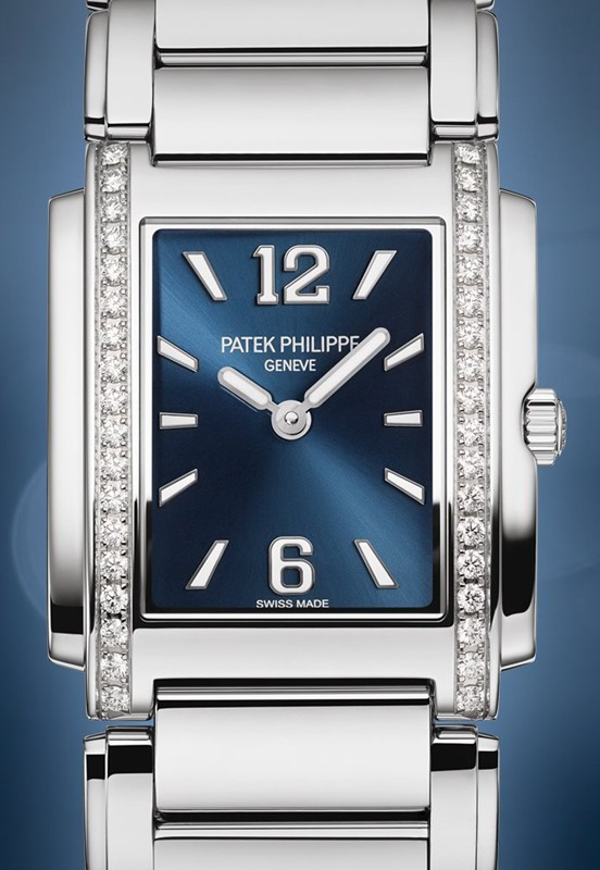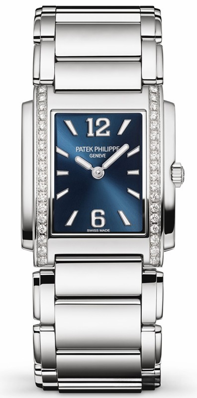 Часы Patek Philippe Twenty-4® 4910/12 представлены в корпусе из нержавеющей стали размером 25.1 х 30 мм водонепроницаемостью 30 метров. Внутри корпуса установлен кварцевый механизм, Калибр E15. На синем циферблате отображаются часы, минуты. Часы поставляются на браслете из нержавеющей стали. Корпус инкрустирован белыми бриллиантами.
