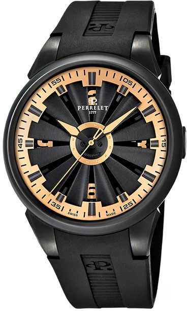 Часы Perrelet Turbine представлены в корпусе из нержавеющей стали с покрытием PVD размером 44 х 13 мм и водонепроницаемостью 50 метров. Внутри корпуса установлен автоматический механизм, Калибр P-331, обладающий запасом хода 42 часа. На золотистом с черным циферблате с турбиной отображаются часы, минуты, секунды. Модель комплектуется каучуковым ремешком с вставкой из нержавеющей стали.