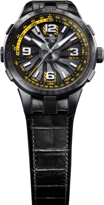 Turbine Pilot - первая настоящая авиационная версия Turbine. Turbine Pilot с диаметром 48 мм являются большими часами линии Turbine, но не самыми большими в коллекции Perrelet. Корпус изготовлен из нержавеющей стали с покрытием PVD. Несмотря на ширину, они всего лишь 13.48 мм толщиной, имеют тонкий профиль в соотношении ширины и толщины. Корпус продолжает соблюдать дизайн оригинала с боковыми выступами и ушками, который представляет собой современную версию классических Perrelet. Естественно Turbine Pilot имеет некоторые пилотные функции. У Turbine Pilot есть вращающийся безель с логарифмической линейкой вместе с отдельной заводной головкой. Эта функция добавляет техническое значение в общий дизайн. Довольно разборчивый циферблат покрыт сапфировым стеклом над вращающимися лопастями двигателя. Будучи авиационными часами, они имеют необходимый уровень сложности циферблата. Внутри часов Perrelet находится автоматический Калибр P-331.