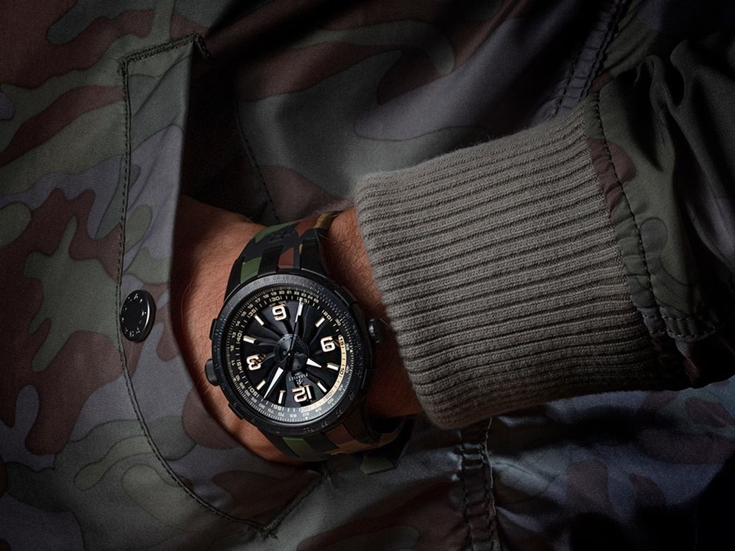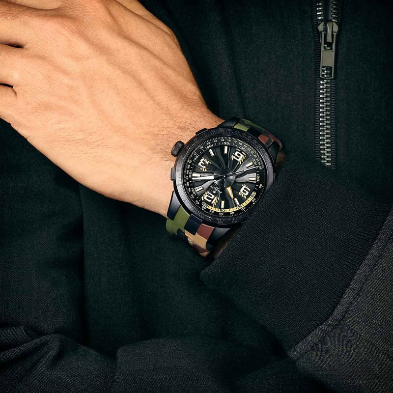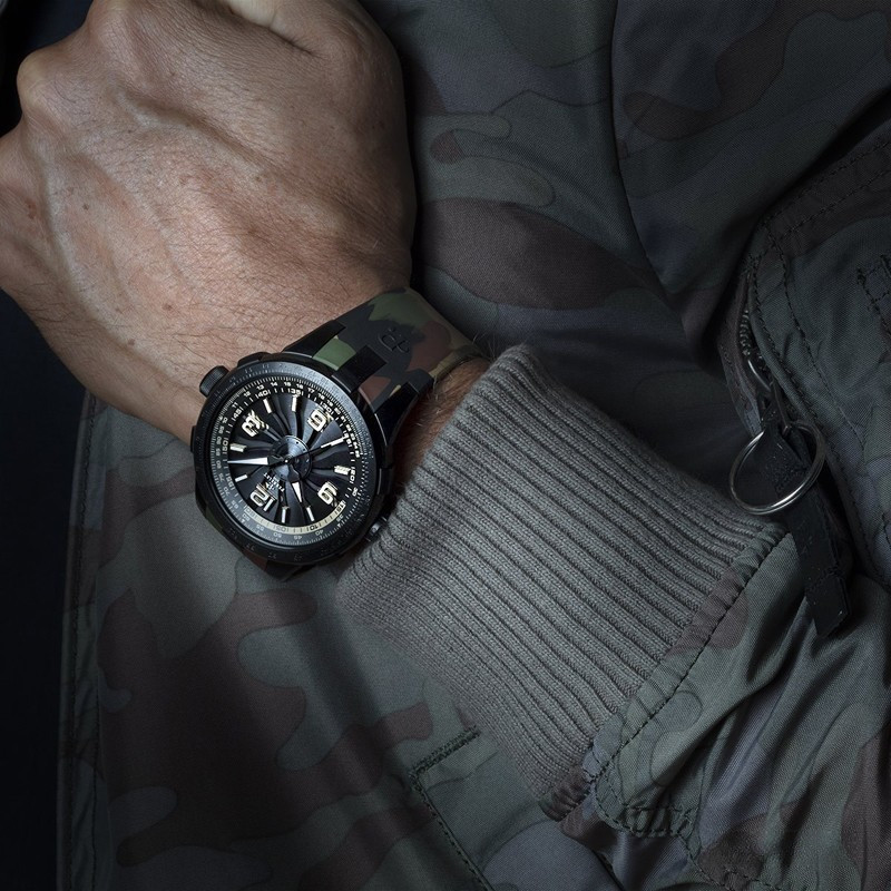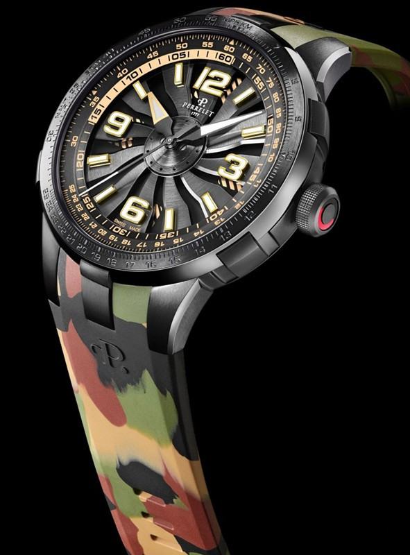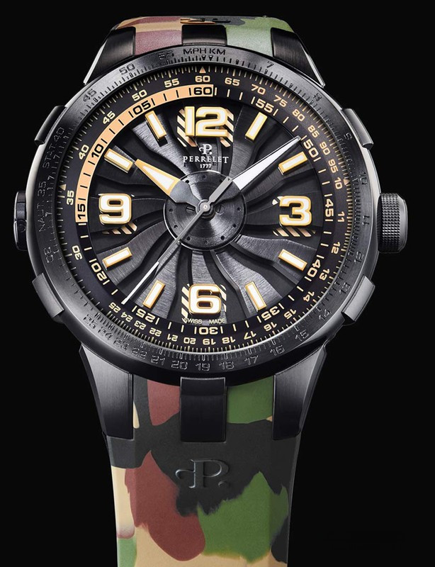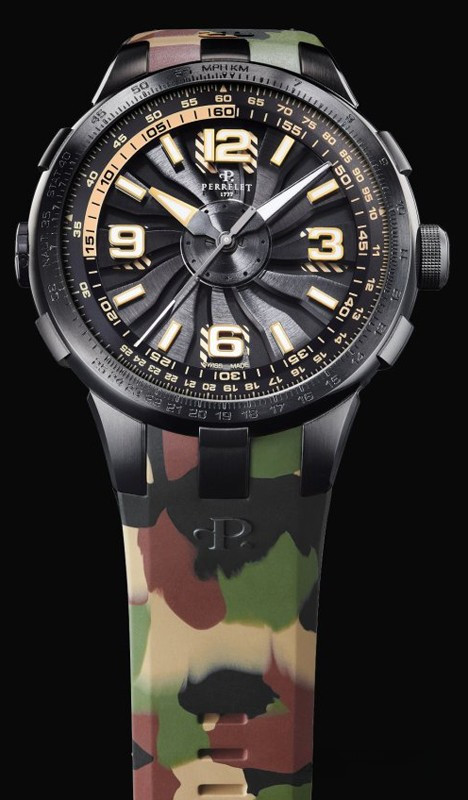 Turbine Pilot - первая настоящая авиационная версия Turbine. Turbine Pilot с диаметром 48 мм являются большими часами линии Turbine, но не самыми большими в коллекции Perrelet. Корпус изготовлен из нержавеющей стали с покрытием PVD. Несмотря на ширину, они всего лишь 13.48 мм толщиной, имеют тонкий профиль в соотношении ширины и толщины. Корпус продолжает соблюдать дизайн оригинала с боковыми выступами и ушками, который представляет собой современную версию классических Perrelet. Естественно Turbine Pilot имеет некоторые пилотные функции. У Turbine Pilot есть вращающийся безель с логарифмической линейкой вместе с отдельной заводной головкой. Эта функция добавляет техническое значение в общий дизайн. Довольно разборчивый циферблат покрыт сапфировым стеклом над вращающимися лопастями двигателя. Будучи авиационными часами, они имеют необходимый уровень сложности циферблата. Внутри часов Perrelet находится автоматический Калибр P-331.