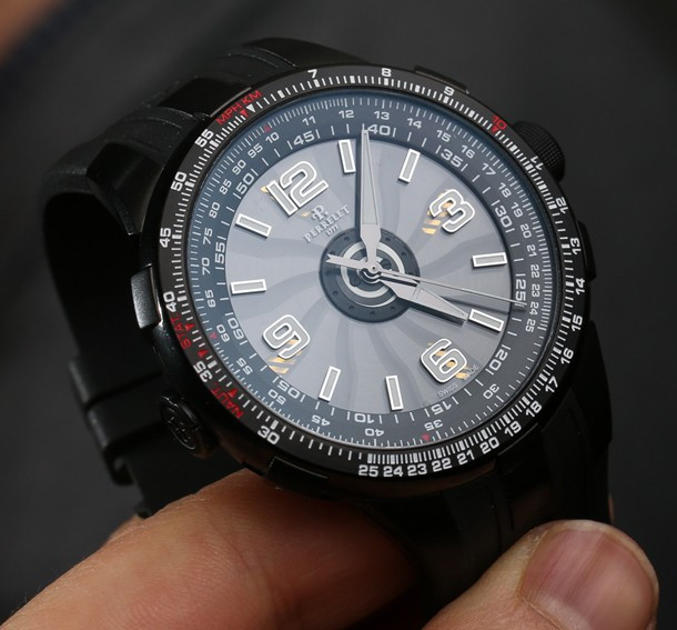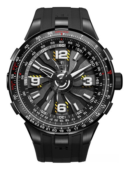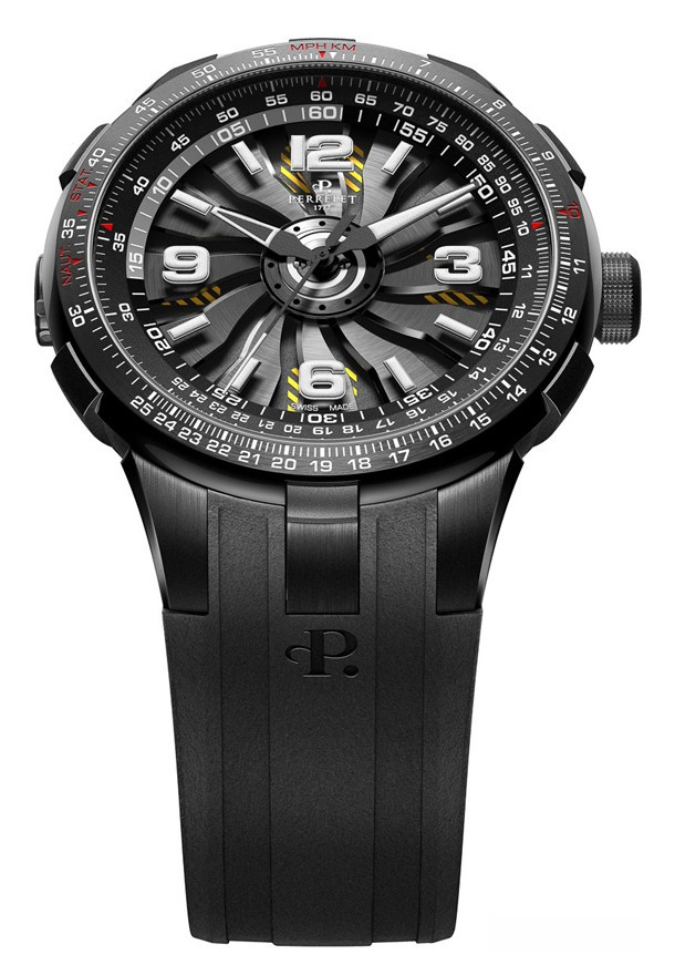 Turbine Pilot 2014 - первая настоящая авиационная версия Turbine. Turbine Pilot с диаметром 48 мм являются большими часами линии Turbine, но не самыми большими в коллекции Perrelet. Корпус изготовлен из нержавеющей стали с покрытием PVD Несмотря на ширину, они всего лишь 13.65 мм толщиной, имеют тонкий профиль в соотношении ширины и толщины. Корпус продолжает соблюдать дизайн оригинала с боковыми выступами и ушками, который представляет собой современную версию классических Perrelet. Естественно Turbine Pilot имеет некоторые пилотные функции. У Turbine Pilot есть вращающийся безель с логарифмической линейкой вместе с отдельной заводной головкой. Эта функция добавляет техническое значение в общий дизайн, и представляет собой еще один элемент, за который люди готовы доплачивать, несмотря на то, что возможно не станут его использовать. Довольно разборчивый циферблат покрыт сапфировым стеклом над вращающимися лопастями двигателя. Будучи авиационными часами, они имеют необходимый уровень сложности циферблата. Внутри часов Perrelet находится автоматический Калибр P-331.