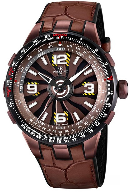 Turbine Pilot - первая настоящая авиационная версия Turbine. Turbine Pilot с диаметром 48 мм являются большими часами линии Turbine, но не самыми большими в коллекции Perrelet. Корпус изготовлен из нержавеющей стали с покрытием PVD. Несмотря на ширину, они всего лишь 13.65 мм толщиной, имеют тонкий профиль в соотношении ширины и толщины. Корпус продолжает соблюдать дизайн оригинала с боковыми выступами и ушками, который представляет собой современную версию классических Perrelet. Естественно Turbine Pilot имеет некоторые пилотные функции. У Turbine Pilot есть вращающийся безель с логарифмической линейкой вместе с отдельной заводной головкой. Эта функция добавляет техническое значение в общий дизайн, и представляет собой еще один элемент, за который люди готовы доплачивать, несмотря на то, что возможно не станут его использовать. Довольно разборчивый циферблат покрыт сапфировым стеклом над вращающимися лопастями двигателя. Будучи авиационными часами, они имеют необходимый уровень сложности циферблата. Внутри часов Perrelet находится автоматический Калибр P-331.