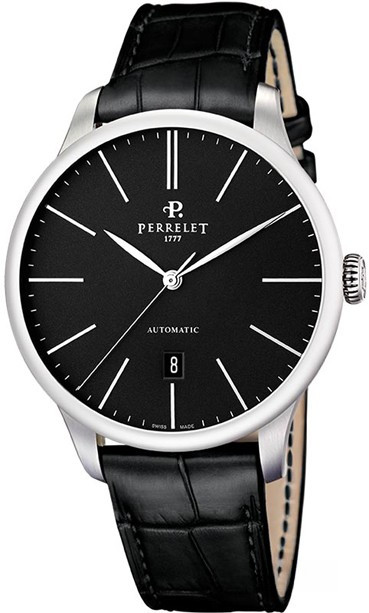 Часы Perrelet First Class представлены в корпусе из нержавеющей стали размером 42.5 х 10.7 мм и водонепроницаемостью 50 метров. Внутри корпуса установлен автоматический механизм, Калибр P-321, обладающий запасом хода 42 часа. На черном циферблате отображаются часы, минуты, секунды, дата. Модель комплектуется ремешком из кожи аллигатора с вставкой из нержавеющей стали.