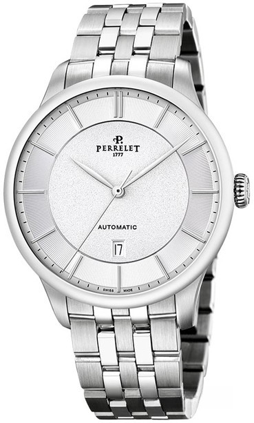 Часы Perrelet First Class представлены в корпусе из нержавеющей стали размером 42.5 х 10.7 мм и водонепроницаемостью 50 метров. Внутри корпуса установлен автоматический механизм, Калибр P-321, обладающий запасом хода 42 часа. На серебристом циферблате отображаются часы, минуты, секунды, дата. Модель комплектуется браслетом из нержавеющей стали.