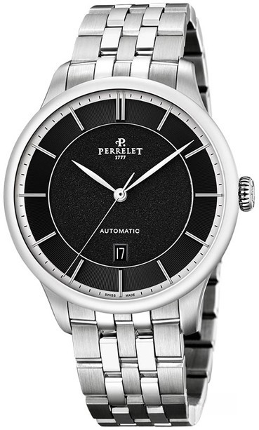 Часы Perrelet First Class представлены в корпусе из нержавеющей стали размером 42.5 х 10.7 мм и водонепроницаемостью 50 метров. Внутри корпуса установлен автоматический механизм, Калибр P-321, обладающий запасом хода 42 часа. На черном циферблате отображаются часы, минуты, секунды, дата. Модель комплектуется браслетом из нержавеющей стали.