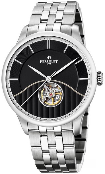 Часы Perrelet First Class Open Heart представлены в корпусе из нержавеющей стали размером 42.5 х 10.7 мм и водонепроницаемостью 50 метров. Внутри корпуса установлен автоматический механизм, Калибр P-391, обладающий запасом хода 42 часа. На черном гильошированном циферблате отображаются часы, минуты, секунды, апертура балансового колеса. Модель комплектуется браслетом из нержавеющей стали.