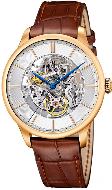 Часы Perrelet First Class Skeleton представлены в корпусе из розового золота 18к размером 42.5 х 10.7 мм и водонепроницаемостью 50 метров. Внутри корпуса установлен автоматический механизм, Калибр P-381, обладающий запасом хода 42 часа. На серебристом скелетированном циферблате отображаются часы, минуты, секунды. Модель комплектуется ремешком из кожи аллигатора с вставкой из розового золота 18к.