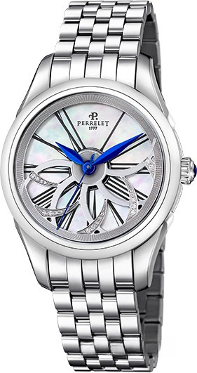 Часы Perrelet Diamond Flower Amytis представлены в корпусе из нержавеющей стали размером 36.5 х 12.3 мм и водонепроницаемостью 50 метров. Внутри корпуса установлен автоматический механизм, Калибр P-181-H, обладающий запасом хода 42 часа. На белом жемчужном циферблате с белыми бриллиантами отображаются часы, минуты, секунды. Модель комплектуется браслетом из нержавеющей стали.