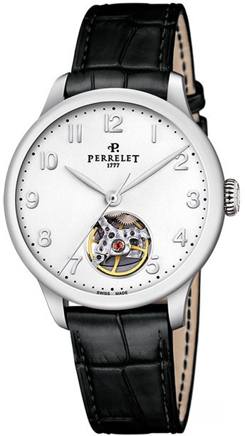 Часы Perrelet First Class Lady Open Heart представлены в корпусе из нержавеющей стали размером 35 х 10 мм и водонепроницаемостью 50 метров. Внутри корпуса установлен автоматический механизм, Калибр P-391, обладающий запасом хода 42 часа. На белом циферблате отображаются часы, минуты, секунды. Модель комплектуется ремешком из кожи аллигатора с вставкой из нержавеющей стали.
