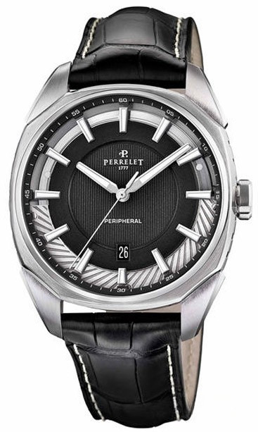 Часы Perrelet LAB представлены в корпусе из нержавеющей стали размером 42 х 42 х 13.25 мм и водонепроницаемостью 50 метров. Внутри корпуса установлен автоматический механизм. На черном гильошированном циферблате отображаются часы, минуты, секунды, дата. Часы комплектуются ремешком из кожи аллигатора с вставкой из нержавеющей стали.