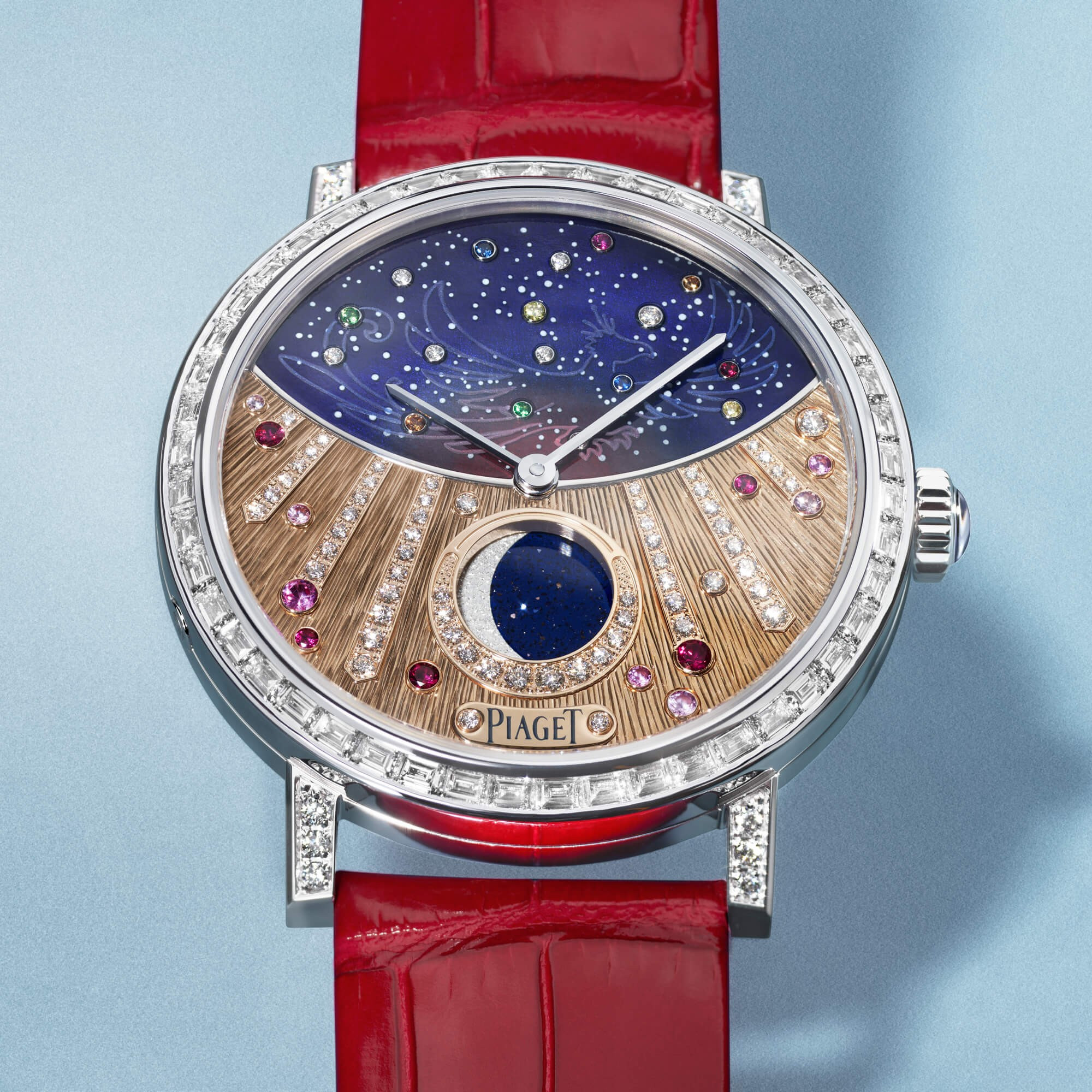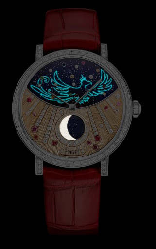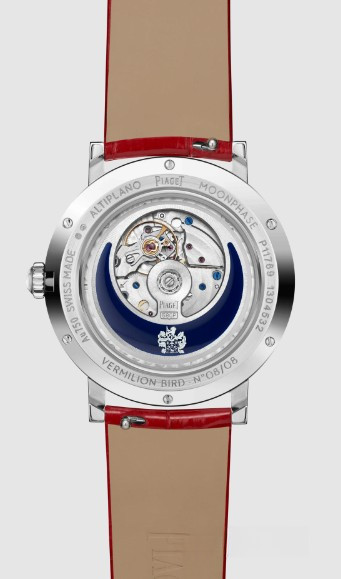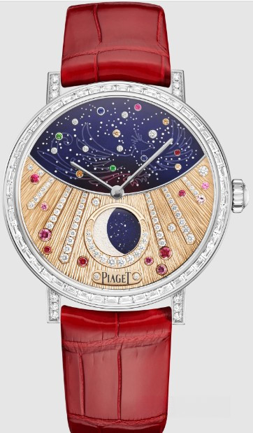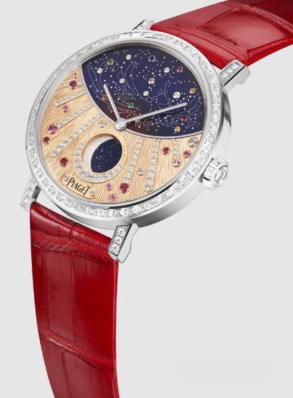 Часы Piaget Altiplano Moonphase High Jewelry 36 представлены в корпусе размером 36 х 9.78 мм из белого золота 18к водонепроницаемостью 30 метров. Внутри корпуса установлен автоматический механизм, Калибр 580P, обладающий запасом хода 42 часа. На золотистом с синим циферблате с белыми бриллиантами отображаются часы, минуты, фаза луны. Часы поставляются на ремешке из кожи аллигатора с золотой застежкой. Корпус инкрустирован белыми багетными бриллиантами. Серия ограничена - 8 шт.