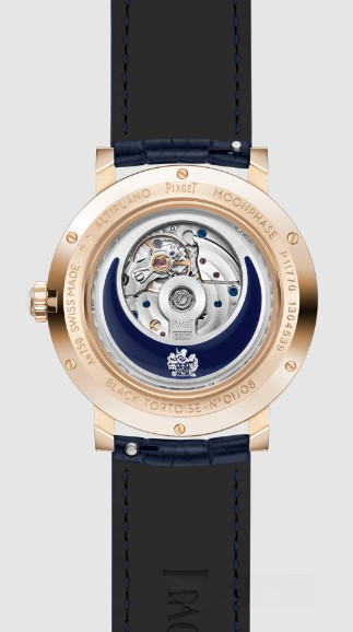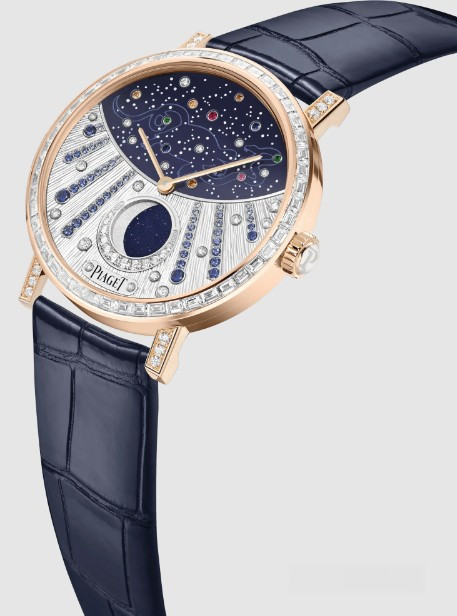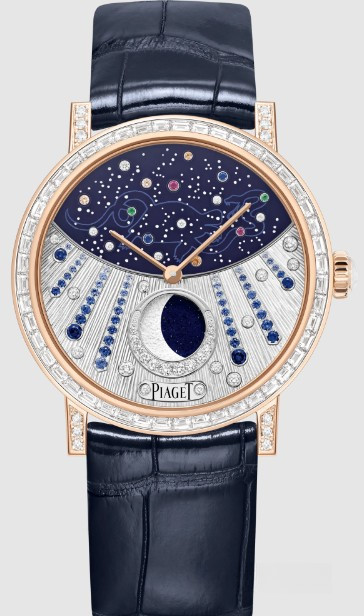 Часы Piaget Altiplano Moonphase High Jewelry 36 представлены в корпусе размером 36 х 9.78 мм из розового золота 18к водонепроницаемостью 30 метров. Внутри корпуса установлен автоматический механизм, Калибр 580P, обладающий запасом хода 42 часа. На серебристом с синим циферблате с белыми бриллиантами отображаются часы, минуты, фаза луны. Часы поставляются на ремешке из кожи аллигатора с золотой застежкой. Корпус инкрустирован белыми багетными бриллиантами. Серия ограничена - 8 шт.