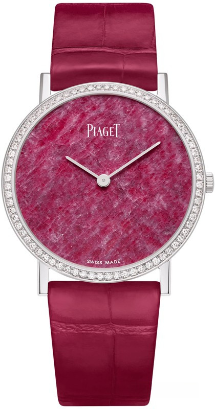 Часы Piaget Altiplano, 34 мм. Корпус из белого золота 18 карат с водонепроницаемостью до 30 метров. Задняя крышка из сапфирового стекла. Ультратонкий мануфактурный механизм Piaget 430Р с ручным заводом. На красном циферблате отображаются часы, минуты. Поставляется на ремешке из кожи аллигатора с вставкой из белого золота 18к. Безель из белых бриллиантов.