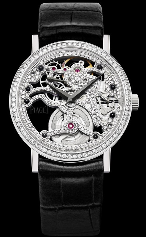 Часы Piaget Altiplano, модель «скелетон», 34 мм. Корпус из белого золота 18 карат с 69 бриллиантами круглой огранки (около 0,6 карата). Застежка с 23 бриллиантами круглой огранки (около 0,04 карата). Задняя крышка из сапфирового стекла. Ультратонкий мануфактурный механизм «скелетон» Piaget 838D с ручным заводом. Платина механизма из белого золота. Малая секундная стрелка. Механизм украшен 219 бриллиантами круглой огранки (около 0,6 карата) и 8 черными сапфирами огранки «кабошон» (около 0,2 карата). Украшенный бриллиантами ультратонкий механизм-«скелетон» из белого золота 838D с ручным заводом толщиной 3,1 мм представляет собой версию скелетонированного механизма 838S и относится к третьему поколению ультратонких механизмов Piaget с ручным заводом. Его перфорированные мосты позволяют детально рассмотреть все детали часового механизма, в том числе баланс на винтах. Прекрасное воплощение уникального мастерства Дома Piaget, механизм-«скелетон» 838D выделяется украшенными бриллиантами ультратонкими мостами, для отделки которых потребовалась невероятная точность.