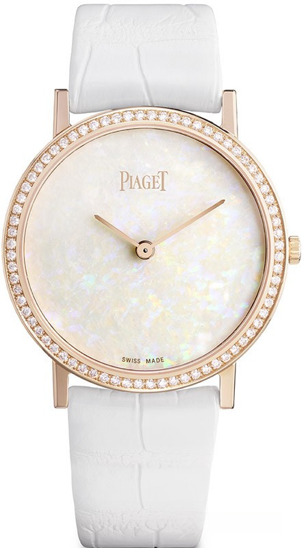Часы Piaget Altiplano, 34 мм. Корпус из роозвого золота 18 карат с водонепроницаемостью до 30 метров. Задняя крышка из сапфирового стекла. Ультратонкий мануфактурный механизм Piaget 838D с ручным заводом. Платина механизма из розового золота. На опаловом циферблате отображаются часы и минуты. Поставляется на ремешке из кожи аллигатора с вставкой из розового золота 18к. Безель из белых бриллиантов.