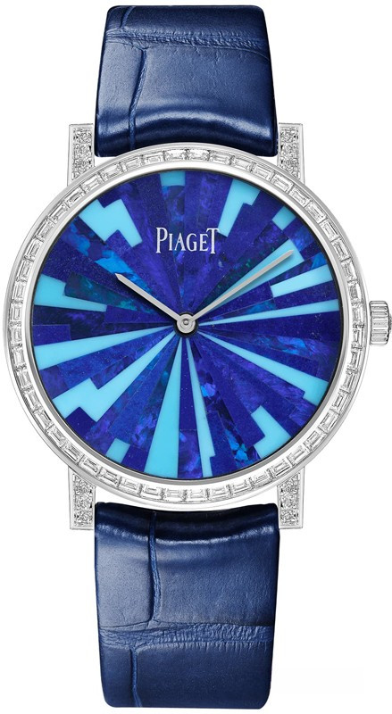 Часы Piaget Altiplano 36 mm комплектуются механизмом с ручным заводом, Калибр Piaget 430P, обладающий запасом хода 43 часа. Корпус размером 36 х 6.6 мм изготовлен из белого золота 18к, водонепроницаемость до 30 метров. На синем циферблате отображаются часы и минуты. Часы комплектуются ремешком из кожи аллигатора с вставкой из белого золота 18к. Корпус инкрустирован белыми багетными бриллиантами. Серия ограничена - 3 шт.