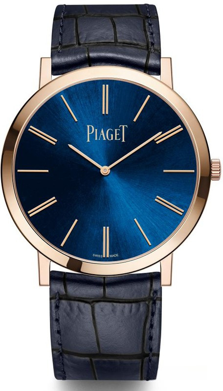 Часы Piaget Altiplano 38 mm представлены в корпусе из розового золота 18к размером 38 мм водонепроницаемостью 30 метров. Внутри корпуса установлен механизм с ручным заводом, Калибр 430P, обладающий запасом хода 43 часа. На синем циферблате отображаются часы, минуты. Часы поставляются на ремешке из кожи аллигатора с вставкой из розового золота 18к. Серия ограничена - 300 шт.