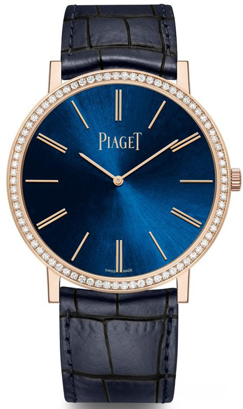 Часы Piaget Altiplano 38 mm представлены в корпусе из розового золота 18к размером 38 мм водонепроницаемостью 30 метров. Внутри корпуса установлен механизм с ручным заводом, Калибр 430P, обладающий запасом хода 43 часа. На синем циферблате отображаются часы, минуты. Часы поставляются на ремешке из кожи аллигатора с вставкой из розового золота 18к. Безель из белых бриллиантов. Серия ограничена - 300 шт.