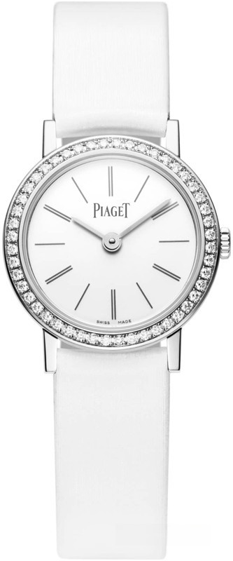 Часы Piaget Altiplano 24 mm представлены в корпусе из белого золота 18к размером 24 мм водонепроницаемостью 30 метров. Внутри корпуса находится кварцевый механизм. На серебристом циферблате отображаются часы, минуты. Часы поставляются на сатиновом ремешке с вставкой из белого золота 18к. Безель из белых бриллиантов.