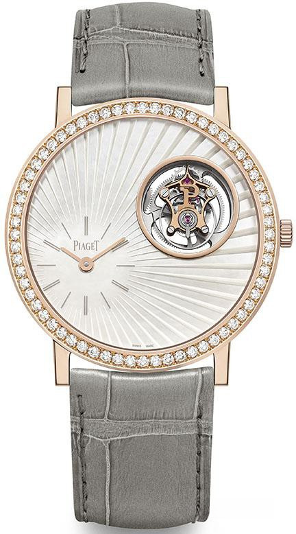 Часы Piaget Altiplano Tourbillon представлены в корпусе из розового золота 18к размером 38 мм водонепроницаемостью 30 метров. Внутри корпуса находится механизм с ручным заводом, Калибр 670P, обладающий запасом хода 48 часов. На серебристом гильошированном циферблате отображаются часы, минуты, секунды. Часы поставляются на ремешке из кожи аллигатора с вставкой из розового золота 18к. Безель из белых бриллиантов. Серия ограничена - 88 шт.