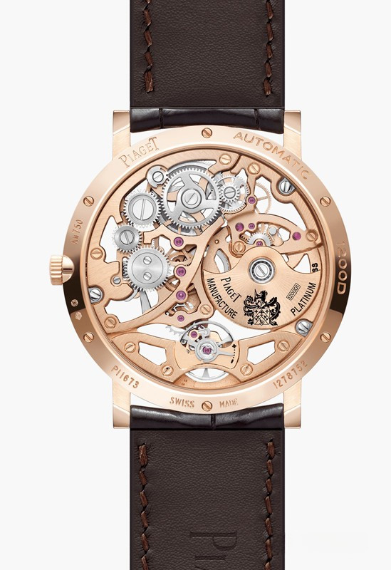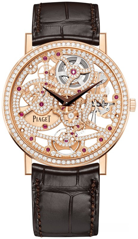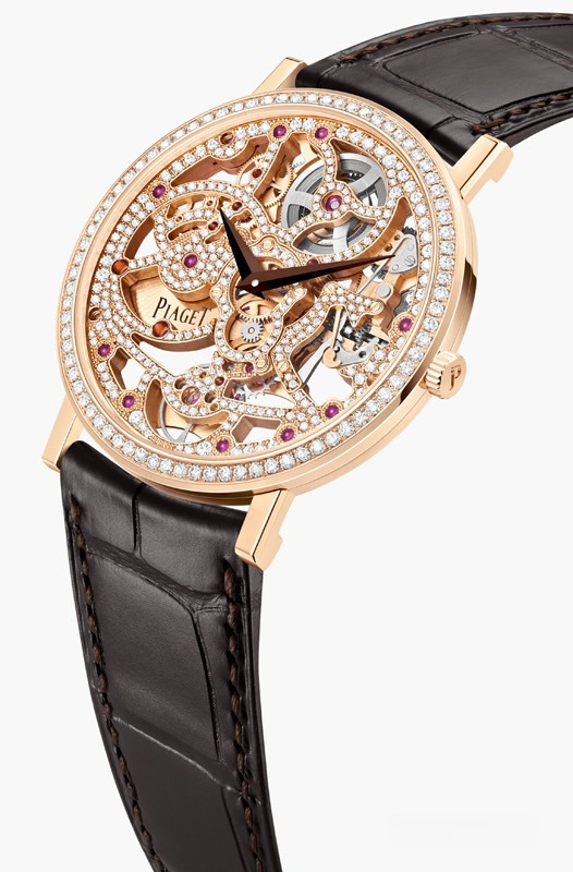 Часы Piaget Altiplano Skeleton 38 mm представлены в корпусе из розового золота 18к размером 38 х 6 мм водонепроницаемостью 30 метров. Внутри корпуса находится автоматический механизм, Калибр Piaget 1200D1, обладающий запасом хода 44 часа. На циферблате с белыми бриллиантами отображаются часы, минуты. Часы поставляются на ремешке из кожи аллигатора с вставкой из розового золота 18к. Безель из белых бриллиантов.