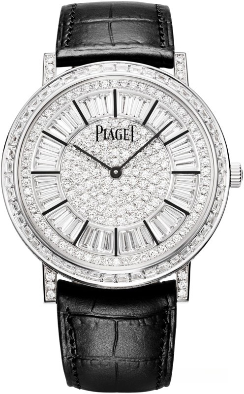 Часы Piaget Altiplano 41 mm комплектуются автоматическим механизмом, Калибр Piaget 1200P, обладающий запасом хода 44 часа. Корпус размером 41 мм изготовлен из белого золота 18к, водонепроницаемость до 30 метров. На циферблате с белыми бриллиантами отображаются часы и минуты. Часы комплектуются ремешком из кожи аллигатора с вставкой из белого золота 18к. Корпус инкрустирован белыми бриллиантами.