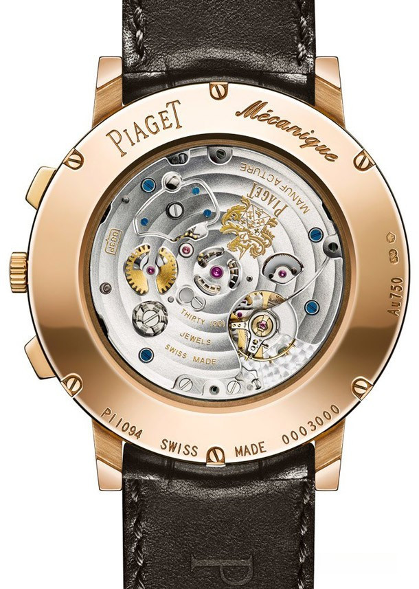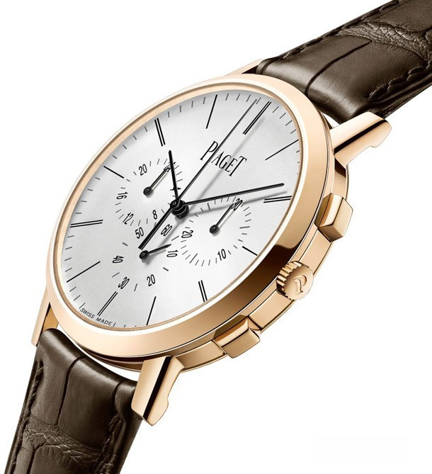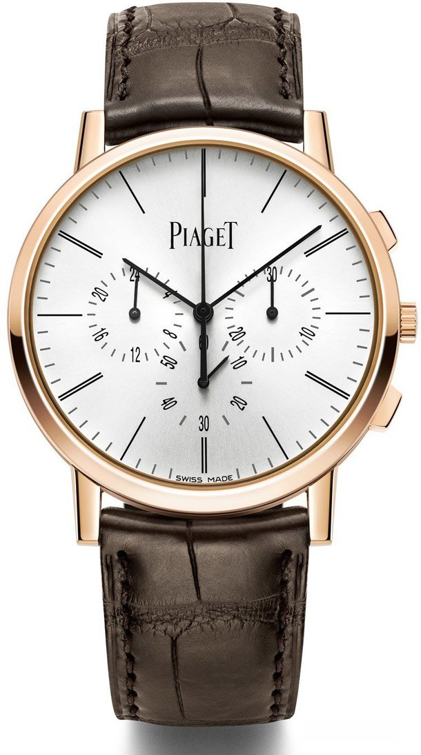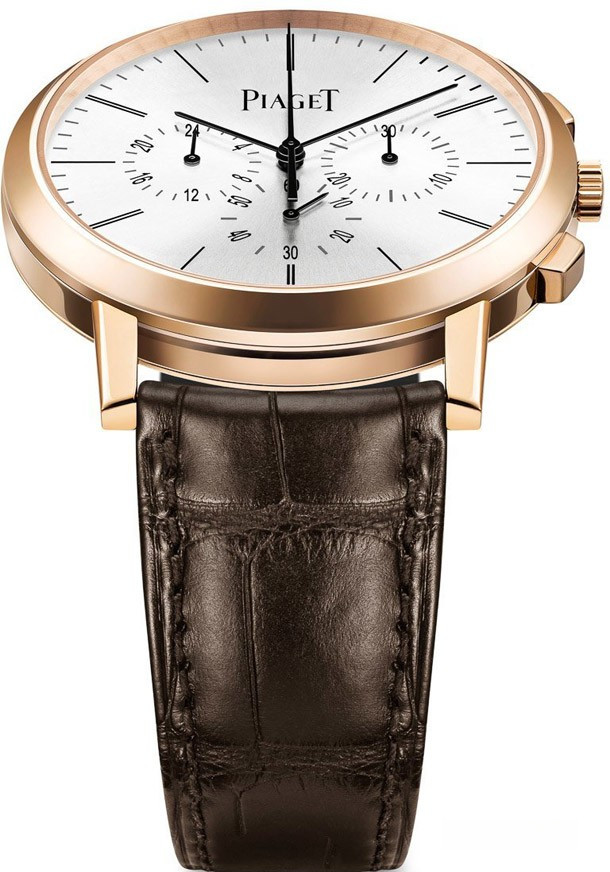 Обладая толщиной 8.24 мм, часы Piaget Altiplano Chronograph будут сидеть очень комфортно на запястье, при этом не напоминая собой тонкую пластину. Минималистский корпус Altiplano имеет современную, но эстетично традиционную форму, а тонкий дизайн циферблата подчеркивается логотипом Piaget. В то время как в традиционном хронографе необходимо сначала остановить запущенный хронограф перед его калибровкой, с функцией обратного хода хронографа можно нажать кнопку сброса и перезапустить хронограф во время его движения. Мануфактурный механизм состоит из 240 компонентов, работает с частотой 3 Гц (21 600 пк/час) и имеет запас хода 50 часов. Редкостью для Altiplano является прозрачная задняя часть корпуса Piaget Altiplano Chronograph. Отделка – типичная по всем стандартам Piaget. Внешний вид модели Piaget Altiplano Chronograph действительно вызывает восхищение. Корпус диаметром 41 мм изготовлен из розового золота 18к.