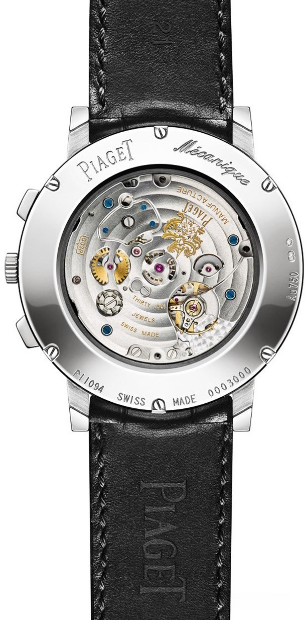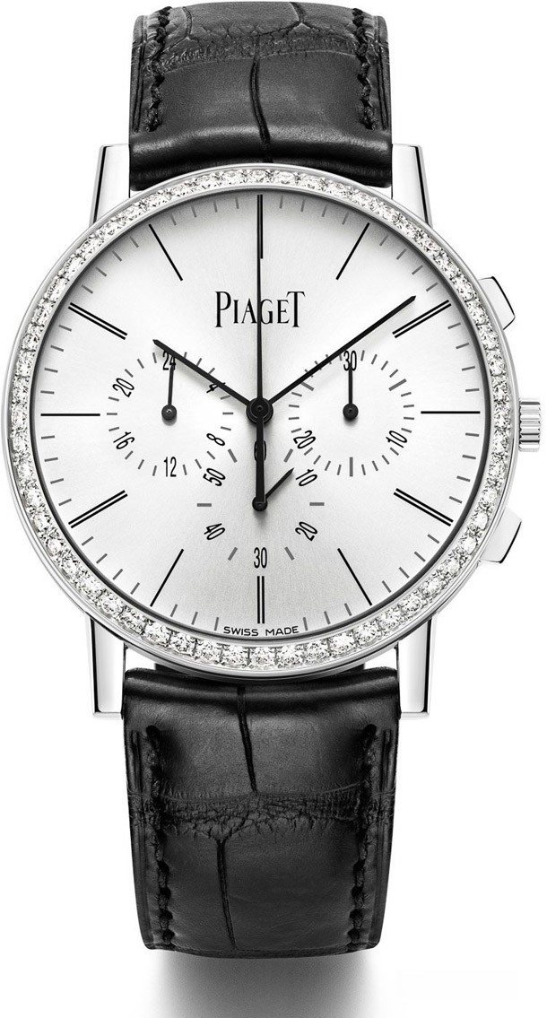 Обладая толщиной 8.24 мм, часы Piaget Altiplano Chronograph будут сидеть очень комфортно на запястье, при этом не напоминая собой тонкую пластину. Минималистский корпус Altiplano имеет современную, но эстетично традиционную форму, а тонкий дизайн циферблата подчеркивается логотипом Piaget. В то время как в традиционном хронографе необходимо сначала остановить запущенный хронограф перед его калибровкой, с функцией обратного хода хронографа можно нажать кнопку сброса и перезапустить хронограф во время его движения. Мануфактурный механизм состоит из 240 компонентов, работает с частотой 3 Гц (21 600 пк/час) и имеет запас хода 50 часов. Редкостью для Altiplano является прозрачная задняя часть корпуса Piaget Altiplano Chronograph. Отделка – типичная по всем стандартам Piaget. Внешний вид модели Piaget Altiplano Chronograph действительно вызывает восхищение. Корпус диаметром 41 мм изготовлен из белого золота 18к, безель инкрустирован 56-ю беыми бриллиантами.