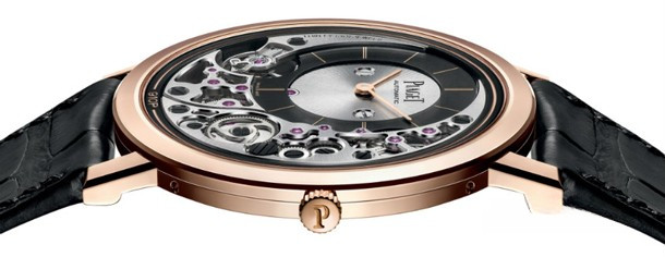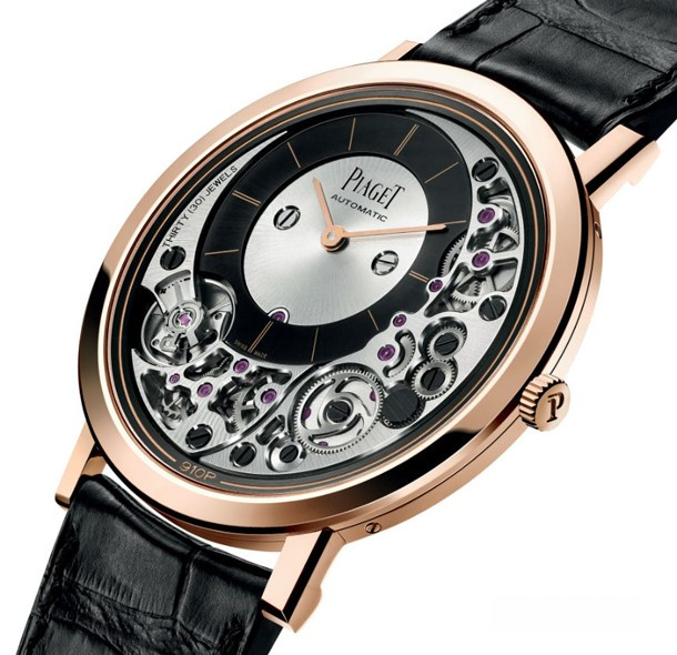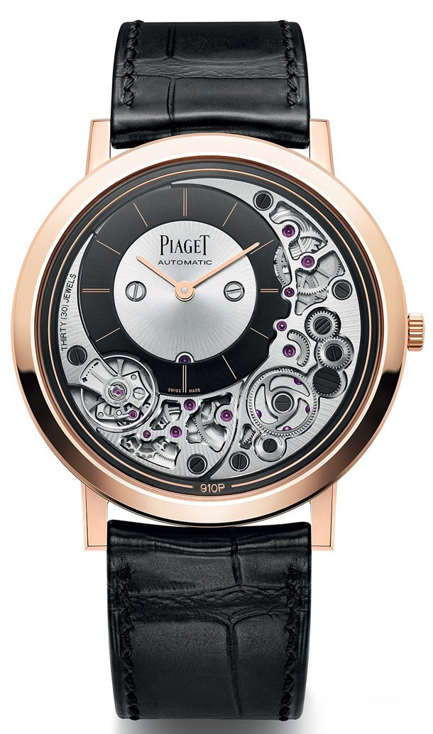 Эта модель стала самыми тонкими автоматическими часами в мире. На создание Piaget Altiplano Ultimate 910P вдохновили другие ультратонкие часы Piaget. Altiplano Ultimate 910P имеют диаметр 41 мм и доступны в корпусе из розового золота 18к. Толщина составляет всего 4,3 мм. Часы поставляются с черным ремешком из кожи аллигатора и золотой пряжкой. Водонепроницаемость 30 м. Поскольку механизм и корпус часов – одно целое, то для максимизации пространства циферблат Altiplano Ultimate 910P смещается к 10-ти часам и немного добавляются мосты. Циферблат окружен разными шестеренками. Баланс расположен прямо под циферблатом на 8-ми часах. Механизм получил название Калибр 910P. Он состоит из 238 деталей, работает с частотой 3 Гц и имеет запас хода около 50 часов при полном заводе. В то время как большинство ультратонких автоматических часов используют микро-ротор, Piaget идет на шаг дальше и вместо этого использует 22-каратный периферийный ротор. Несмотря на тонкость, Piaget не поскупились на отделку. Так как многие из компонентов часов выставлены на обозрение, то колеса были поочередно полированы и сатинированы, мосты скошены, а основная пластина - сатинированная и обработана пескоструем. Кроме того, винты вокруг циферблата покрыты черным PVD.