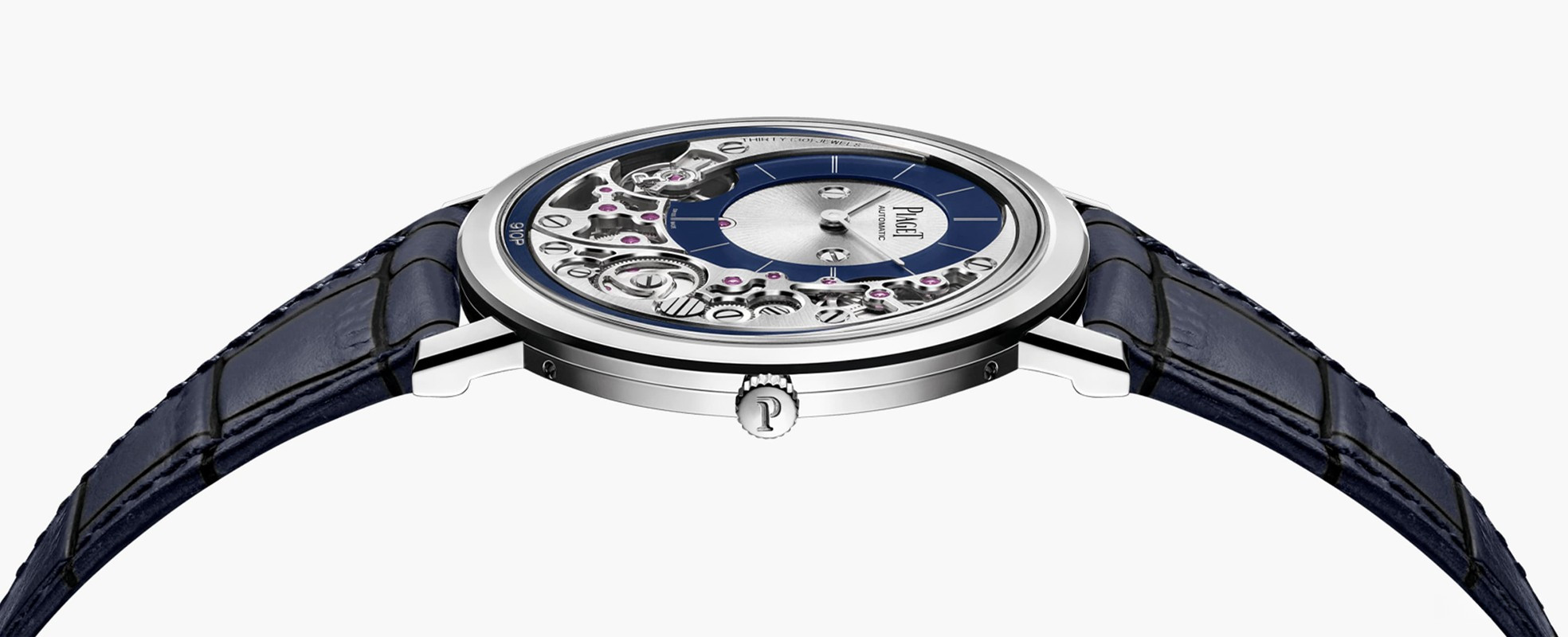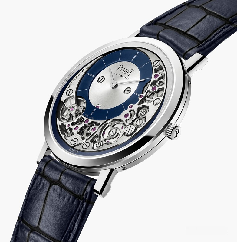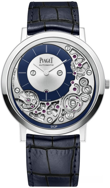 Эта модель стала самыми тонкими автоматическими часами в мире. На создание Piaget Altiplano Ultimate 910P вдохновили другие ультратонкие часы Piaget. Altiplano Ultimate 910P имеют диаметр 41 мм и доступны в корпусе из белого золота 18к. Толщина составляет всего 4,3 мм. Часы поставляются с черным ремешком из кожи аллигатора и золотой пряжкой. Водонепроницаемость 30 м. Поскольку механизм и корпус часов – одно целое, то для максимизации пространства циферблат Altiplano Ultimate 910P смещается к 10-ти часам и немного добавляются мосты. Циферблат окружен разными шестеренками. Баланс расположен прямо под циферблатом на 8-ми часах. Механизм получил название Калибр 910P. Он состоит из 238 деталей, работает с частотой 3 Гц и имеет запас хода около 50 часов при полном заводе. В то время как большинство ультратонких автоматических часов используют микро-ротор, Piaget идет на шаг дальше и вместо этого использует 22-каратный периферийный ротор. Несмотря на тонкость, Piaget не поскупились на отделку. Так как многие из компонентов часов выставлены на обозрение, то колеса были поочередно полированы и сатинированы, мосты скошены, а основная пластина - сатинированная и обработана пескоструем. Кроме того, винты вокруг циферблата покрыты черным PVD.