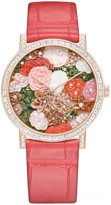 Часы Piaget Altiplano High Jewelry Watch 36 mm представлены в корпусе из розового золота 18к размером 36 х 7.6 мм водонепроницаемостью 30 метров. Внутри корпуса находится механизм с ручным заводом, Калибр Piaget 430P, обладающий запасом хода 43 часа. На циферблате с цветочным мотивом и белыми бриллиантами отображаются часы, минуты. Часы поставляются на ремешке из кожи аллигатора с вставкой из розового золота 18к. Корпус инкрустирован белыми бриллиантами.