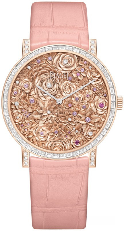 Часы Piaget Altiplano High Jewelry Watch 36 mm представлены в корпусе из розового золота 18к размером 36 х 7.6 мм водонепроницаемостью 30 метров. Внутри корпуса находится механизм с ручным заводом, Калибр Piaget 430P, обладающий запасом хода 43 часа. На циферблате с цветочным мотивом и белыми бриллиантами отображаются часы, минуты. Часы поставляются на ремешке из кожи аллигатора с вставкой из розового золота 18к. Корпус инкрустирован белыми бриллиантами.