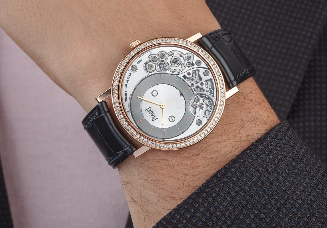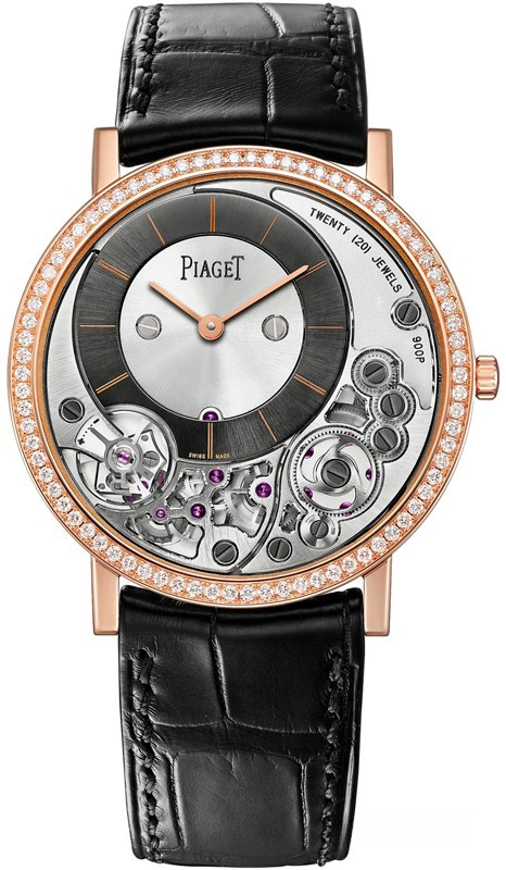 Piaget Altiplano 38 MM 900Р - самые тонкие в мире механические часы с ручным заводом из коллекции высокого ювелирного искусства. Корпус диаметром 38 мм, розовое золото 18 карат. Золотые стрелки в форме палочек. Ремешок из кожи аллигатора с крупным квадратным рисунком. Тройная раскладывающаяся застежка. Механизм с ручным заводом, мануфактурный калибр Piaget 900Р. Запас хода: приблизительно 48 часов. Частота: 21 600 полуколебаний/час (3 Гц). Функции: часы, смещенный относительно центра минутный счетчик в положении «10 часов». Количество деталей: 145 (корпус + механизм). Отделка: платина с круговым матовым узором, колеса с узором «солнечные лучи», выгравированная буква «P» — фирменный символ Piaget. Водонепроницаемость 20 метров. Безель из белых бриллиантов.