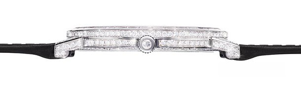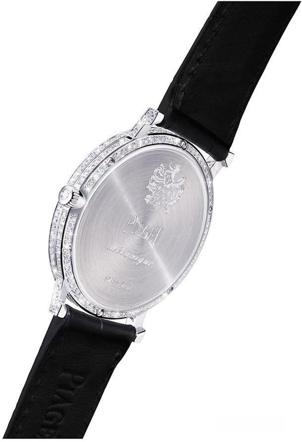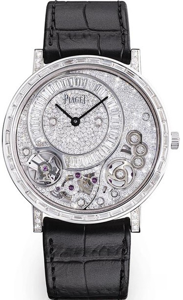 Piaget Altiplano 38 MM 900D - самые тонкие в мире механические часы с ручным заводом из коллекции высокого ювелирного искусства. Корпус диаметром 38 мм, белое золото 18 карат, 38 бриллиантов багетной огранки (общий вес приблизительно 1,36 кар.) и 266 бриллиантов круглой огранки (общий вес приблизительно 1,86 кар.). Заводная головка с бриллиантом круглой огранки (приблизительно 0,06 кар.). Циферблат украшен 33 бриллиантами багетной огранки (общий вес приблизительно 1,34 кар.). Черные стрелки в форме палочек. Черный ремешок из кожи аллигатора с крупным квадратным рисунком. Тройная раскладывающаяся застежка с 23 бриллиантами круглой огранки (общий вес приблизительно 0,05 кар.). Механизм с ручным заводом, мануфактурный калибр Piaget 900D с бриллиантами в закрепке snow-setting. Срок проектирования: 3 года. Время, необходимое на украшение механизма: 4 дня. Запас хода: приблизительно 48 часов. Частота: 21 600 полуколебаний/час (3 Гц). Функции: часы, смещенный относительно центра минутный счетчик в положении «10 часов». Количество деталей: 145 (корпус + механизм). Отделка: платина с круговым матовым узором и бриллиантами круглой огранки, мосты украшены бриллиантами с закрепкой в технике snow-setting, колеса с узором «солнечные лучи», винты с бриллиантами круглой огранки, выгравированная буква «P» — фирменный символ Piaget. Водонепроницаемость: 2 атм.