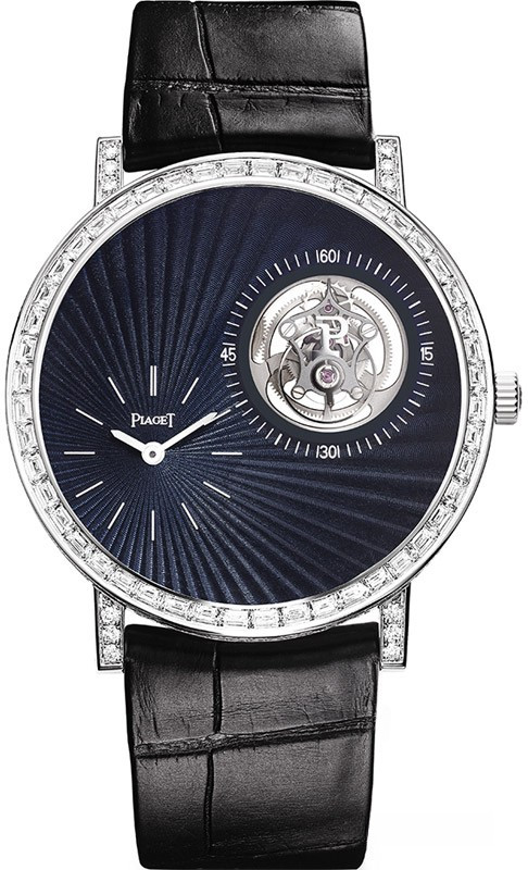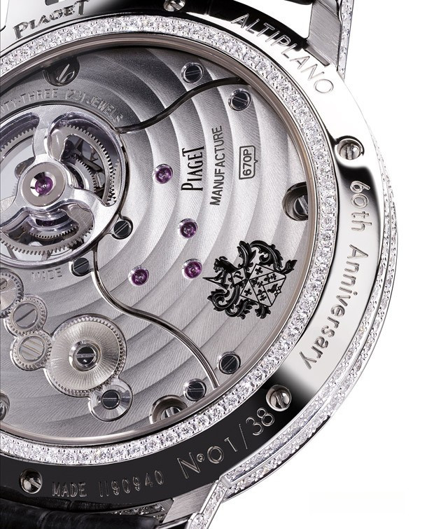 Часы Piaget Altiplano Tourbillon косплектуются ультратонким механизмом Piaget 670P с ручным заводом и турбийоном, его толщтна составляет всего 4,6 мм, что позволяет ему абсолютно органично вписываться в корпус легендарных часов. Он оснащен запатентованной системой подзавода часов со вспомогательным колесом заводной головки. В составе механизма предусмотрен обновленный барабан, который увеличивает запас хода до весьма комфортного срока в 48 часов. Благодаря виртуозности мастеров-ремесленников на свет появился циферблат, украшенный эмалью в технике flinqué: гильошированным узором, вручную нанесенным на золотую основу, а затем деликатно покрытым слоями прозрачной эмали. После этого изделие подвергается трехэтапному обжигу, причем каждый этап выверен с точностью до секунды, а температура в печи доходит до 800 °C. Часовой счетчик и турбийон, воплощающие стиль Piaget, смещены от центра циферблата и незаметно формируют «восьмерку» – символ бесконечности. Гильошированный узор «солнечные лучи» также слегка сдвинут к краю часов и особенно выделяется благодаря насыщенному сине-серому оттенку циферблата. Дом Piaget, непревзойденный в мастерстве соединения ювелирного дела с часовым искусством, украшает корпус, циферблат и застежку этих часов россыпью бриллиантов круглой и багетной огранки, которые придают этому творению потрясающее сияние. В равной степени впечатляет и отделка, отвечающая стандартам коллекции Высокое часовое искусство: механизм декорирован круговым узором «Côtes de Genève»; на платину и мосты вручную нанесено жемчужное зернение; со шлифованных мостов и каретки турбийона вручную сняты фаски. На часовой счетчик Piaget Altiplano Tourbillon категории Высокое ювелирное искусство (референция G0A42204) нанесен исторический логотип Дома в виде надписи «Piaget», а на задней кршке часов выгравировано обозначение юбилейной коллекции.