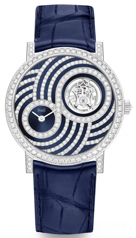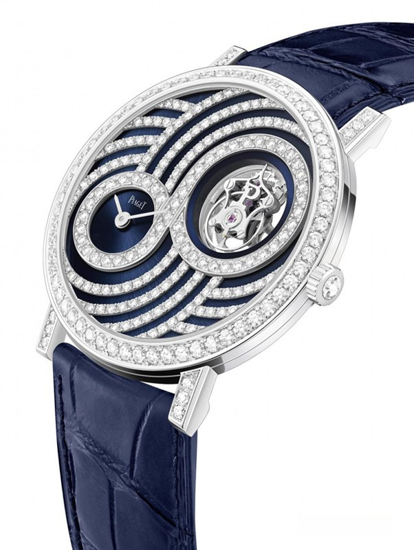 Часы Piaget Altiplano Tourbillon Infinite Blue представлены в корпусе из белого золота 18к размером 41 мм, водонепроницаемостью 30 метров. Внутри корпуса установлен механизм с ручным заводом, Калибр 670P, обладающий запасом хода 48 часов. На синем циферблате с белыми бриллиантами отображаются часы, минуты, секунды, клеть турбийона. Часы комплектуются ремешком из кожи аллигатора с вставкой из белого золота 18к. Корпус инкрустирован белыми бриллиантами. Серия ограничена - 18 шт.