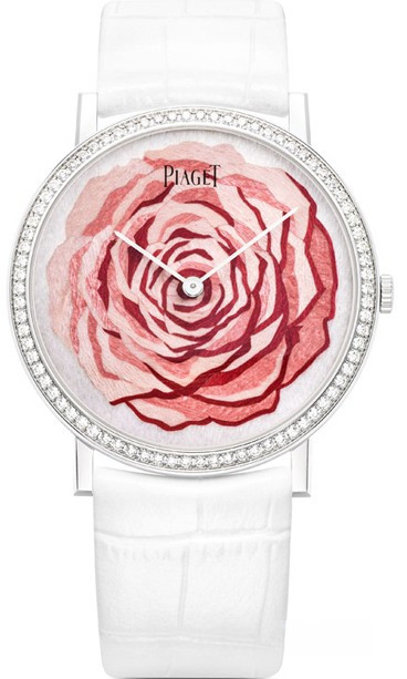 Часы Piaget Altiplano диаметром 38 мм из 18-каратного белого золота с 78 бриллиантами круглой огранки (около 0,7 кар.) на безеле. Циферблат украшен мотивом розы Ива Пьяже, выполненным в технике деревянного маркетри. Мануфактурный ультратонкий калибр Piaget 430P с ручным заводом. Часовая и минутная стрелки. Частота — 21 600 полуколебаний в час. Белый ремешок из кожи аллигатора с застежкой из 18-каратного белого золота. Ограниченная серия из 18 экземпляров.