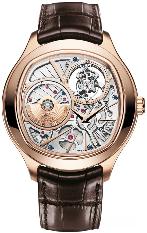 Часы Piaget Emperador Cushion Tourbillon представлены в корпусе из розового золота 18к размером 46.5 х 10.4 мм водонепроницаемостью 30 метров. Внутри корпуса находится автоматический механизм, Калибр Piaget 1270P, обладающий запасом хода 42 часа. На серебристом циферблате отображаются часы, минуты, секунды, турбийон. Часы поставляются на ремешке из кожи аллигатора с вставкой из розового золота 18к.
