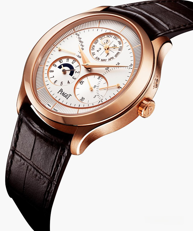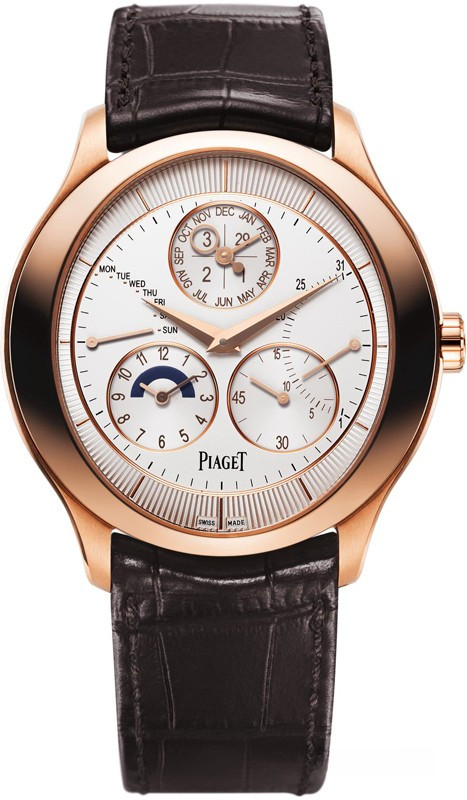 Часы Piaget Black Tie Gouverneur 43 mm представлены в корпусе из розового золота 18к размером 43 х 10.5 мм водонепроницаемостью 30 метров. Внутри корпуса находится механизм с ручным заводом, Калибр Piaget 855P, обладающий запасом хода 72 часа. На серебристом циферблате отображаются часы, минуты, секунды, дата, день недели, месяц, цикл високосного года, время второго часового пояса. Часы поставляются на ремешке из кожи аллигатора с вставкой из розового золота 18к.