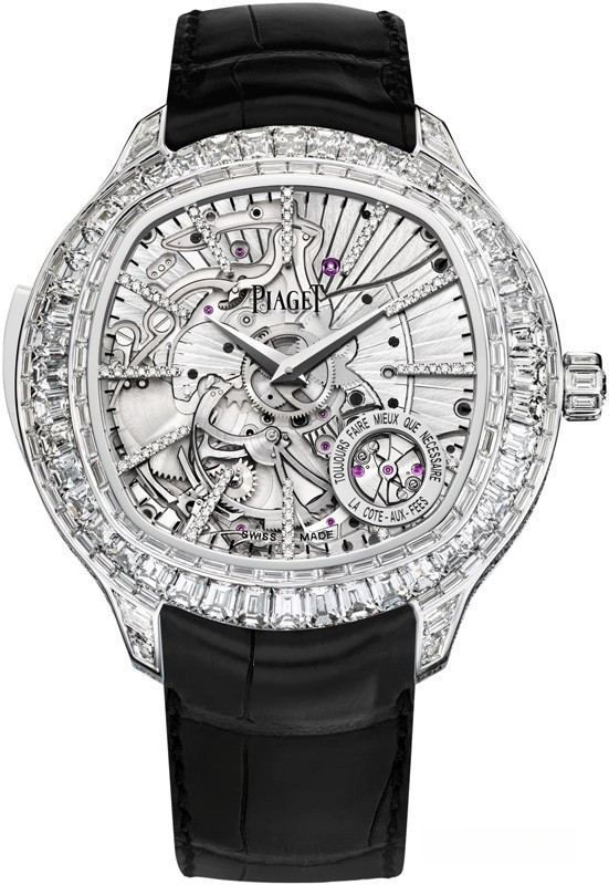 Часы Piager Emperador Cushion представлены в корпусе из белого золота 18к размером 49 мм водонепроницаемостью 30 метров. Внутри корпуса находится автоматический механизм, Калибр Piaget 1290P, обладающий запасом хода 40 часов. На серебристом циферблате отображаются часы, минуты. Часы поставляются на ремешке из кожи аллигатора с вставкой из белого золота 18к. Корпус инкрустирован белыми бриллиантами.