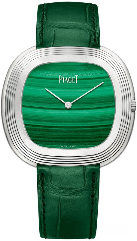Корпус новинки изготовлен из 18-каратного белого золота, длиной 45 мм и шириной 43 мм. Рифленая заводная головка расположена на 3 часах таким образом, что не выходит за контур корпуса. Сатинированный безель выполнен в ступенчатой форме. Сапфировое стекло защищает циферблат, выполненный из зеленого малахита, без разметки, с наименованием бренда Piaget на 12 часах. Стрелки из розового золота. Модель оснащена мануфактурным швейцарским автоматическим механизмом Piaget 534P, с функциями индикации часов и минут (посредством соответствующих центральных стрелок). Поставляется на зеленом ремешке из кожи аллигатора с застежкой из 18-каратного белого золота.