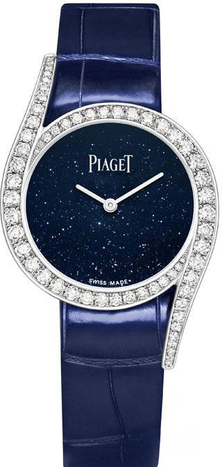 Часы Piaget Limelight Gala 32 mm представлены в корпусе из белого золота 18к размером 32 мм и водонепроницаемостью 30 м. Внутри корпуса установлен кварцевый механизм, Калибр Piaget 690P. На циферблате из синего авантюрина отображаются часы, минуты. Часы комплектуются ремешком из кожи аллигатора с вставкой из белого золота 18к. Корпус инкрустирован белыми бриллиантами.