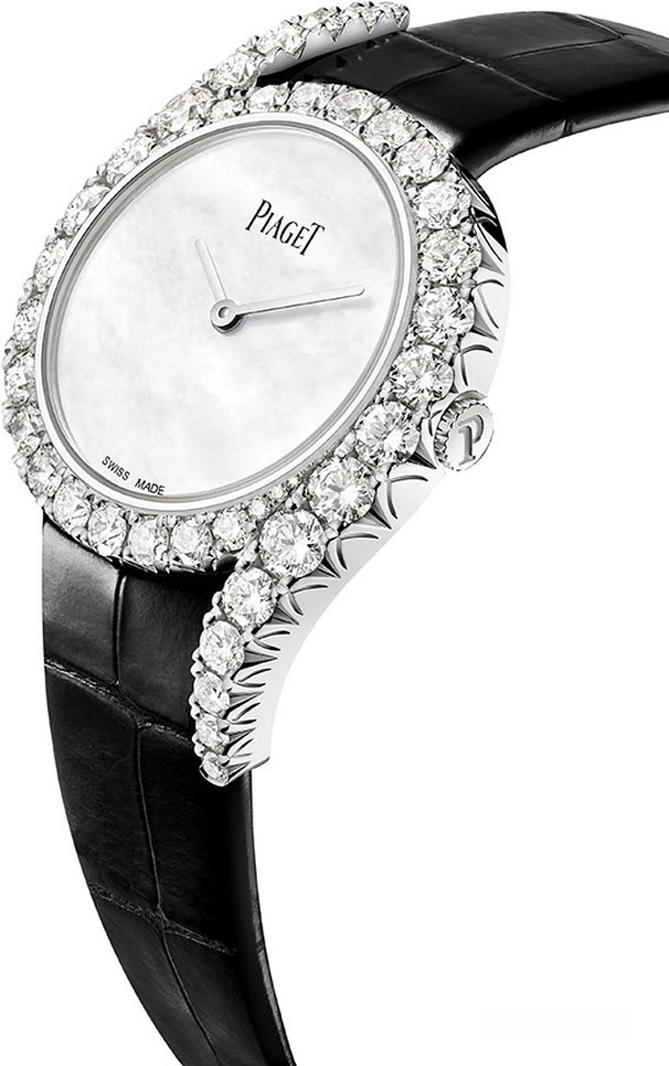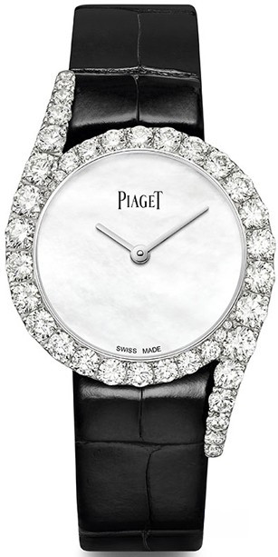 Часы Piaget Limelight Gala 32 mm представлены в корпусе из белого золота 18к размером 32 мм и водонепроницаемостью 30 м. Внутри корпуса установлен кварцевый механизм, Калибр Piaget 690P. На белом жемчужном циферблате отображаются часы, минуты. Часы комплектуются ремешком из кожи аллигатора с вставкой из белого золота 18к. Корпус инкрустирован белыми бриллиантами.