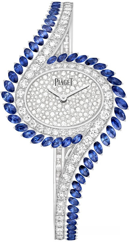 Часы Piaget Limelight Gala High Jewellery представлены в корпусе из белого золота 18к размером 36 х 28 мм водонепроницаемостью 30 метров. Внутри корпуса находится кварцевый механизм, Калибр 56 P. На циферблате с белыми бриллиантами отображаются часы, минуты. Часы поставляются на браслете из белого золота 18к, инкрустированном белыми бриллиантами. Корпус инкрустирован белыми бриллиантами и синими сапфирами.