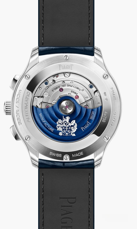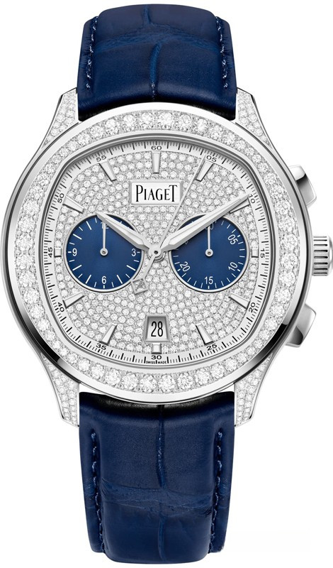 Часы Piaget Polo Automatic Chronograph 42 mm представлены в корпусе из белого золота 18к размером 42 х 11.2 мм водонепроницаемостью 100 метров. Внутри корпуса находится автоматический механизм, Калибр Piaget 1160P, обладающий запасом хода 50 часов. На синем циферблате с белыми бриллиантами отображаются часы, минуты, секунды, дата. Часы поставляются на ремешке из кожи аллигатора с вставкой из белого золота 18к. Корпус инкрустирован белыми бриллиантами.