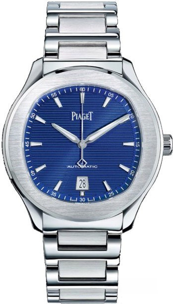Новые часы с автоподзаводом отличаются непринужденной элегантностью, созданы для сильных духом мужчин. Удобный браслет из полированной и матовой стали, идеально интегрированный в корпус часов, подчеркивает современный характер модели. Корпус формы «подушка» сохранил узнаваемые черты Piaget. Синий циферблат с горизонтальным гильошированным узором и люминесцентными накладными часовыми индексами, оснащен основными функциями: часы, минуты, секунды, а также дата в окошке в положении «6 часов». Корпус диаметром 42 мм из стали выглядит особенно изысканно за счет чередования матовых и полированных поверхностей. Водонепроницаемость до 100м. Через сапфировое стекло задней крышки корпуса открывается вид на новый мануфактурный механизм Piaget 1110P с автоподзаводом, отделка которого отвечает самым высоким стандартам, и ротор антрацитового цвета с выгравированным гербом Piaget. Завершающим штрихом к утонченному дизайну служит секундная стрелка с перфорацией в виде буквы «P» – фирменного знака швейцарской Мануфактуры.