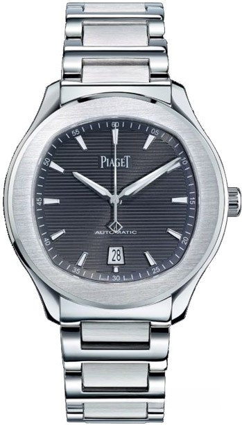 Новые часы с автоподзаводом отличаются непринужденной элегантностью, созданы для сильных духом мужчин. Удобный браслет из полированной и матовой стали, идеально интегрированный в корпус часов, подчеркивает современный характер модели. Корпус формы «подушка» сохранил узнаваемые черты Piaget. Антрацитовый циферблат с горизонтальным гильошированным узором и люминесцентными накладными часовыми индексами, оснащен основными функциями: часы, минуты, секунды, а также дата в окошке в положении «6 часов». Корпус диаметром 42 мм из стали выглядит особенно изысканно за счет чередования матовых и полированных поверхностей. Водонепроницаемость до 100м. Через сапфировое стекло задней крышки корпуса открывается вид на новый мануфактурный механизм Piaget 1110P с автоподзаводом, отделка которого отвечает самым высоким стандартам, и ротор антрацитового цвета с выгравированным гербом Piaget. Завершающим штрихом к утонченному дизайну служит секундная стрелка с перфорацией в виде буквы «P» – фирменного знака швейцарской Мануфактуры.