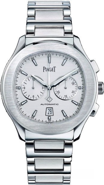 Стильные и элегантные часы с автоподзаводом и хронографом подходят для любого случая. Удобный браслет из полированной и матовой стали, идеально интегрированный в корпус часов, подчеркивает современный характер модели. Корпус формы «подушка» сохранил узнаваемые черты Piaget. Посеребренный циферблат с горизонтальным гильошированным узором и люминесцентными накладными часовыми индексами, оснащен основными функциями: часы, минуты, секунды, хронограф и дата. Корпус диаметром 42 мм из стали выглядит особенно изысканно за счет чередования матовых и полированных поверхностей. Водонепроницаемость до 100м. Через сапфировое стекло задней крышки корпуса открывается вид на новый мануфактурный механизм Piaget 1160P с автоподзаводом и хронографом, а также ротор антрацитового цвета с выгравированным гербом Piaget. Завершающим штрихом к утонченному дизайну служит секундная стрелка хронографа с перфорацией в виде буквы «P» – фирменного знака швейцарской Мануфактуры.
